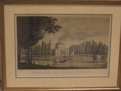 Hand-Colored Stipple Engraving. Tiebout, Cornelius, after Barralet, John James. "View of the Waterworks at Center Square, Philadelphia." (Philadelphia: H. Quiz, n.d. [c1830]. 3rd state. 14 x 21 inches; 355 x 533mm, light to moderate mat burn, edge mounted to bd. Clean and attractive. Framed.