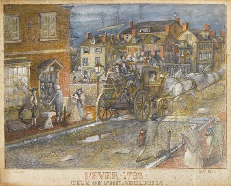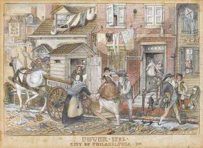 Original Watercolors. "Fever 1793/ City of Philadelphia, PA." 8 x 10 inches; 205 x 255 mm. Initialed & dated 'D.K. 1827' lower right.