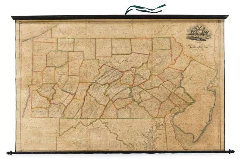 Engraved Map with Hand Outline Color. Melish, John. "Map of Pennsylvania." Philadelphia: B. Tanner, 1826. 49 x 75 inches; 1245 x 1905 mm; 50 x 76 1/8 inches; 1270 x 1935mm - sheet size. Canvas backed. Slightly to moderately toned, very minor surface wear. With 19th century wood rollers. Attractive, with orig. color.