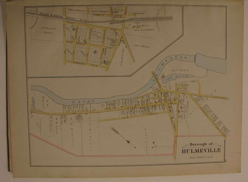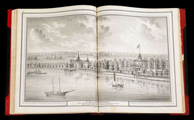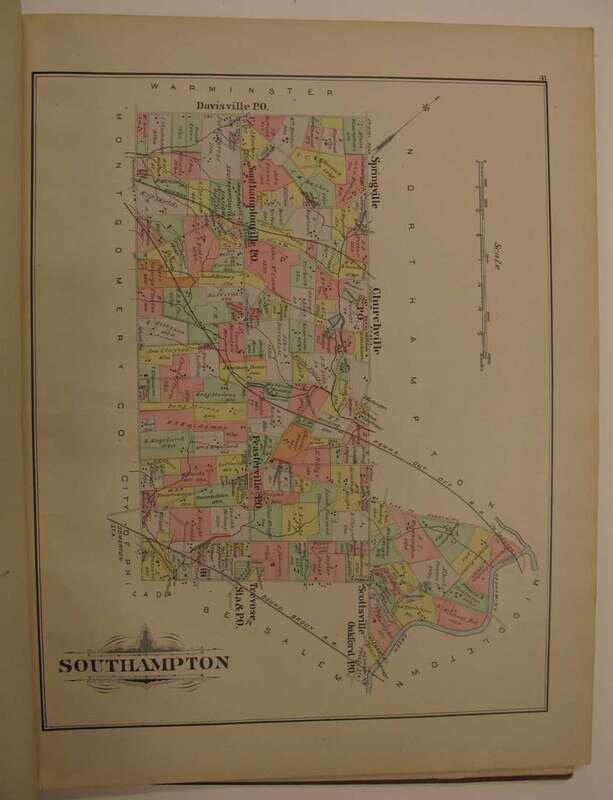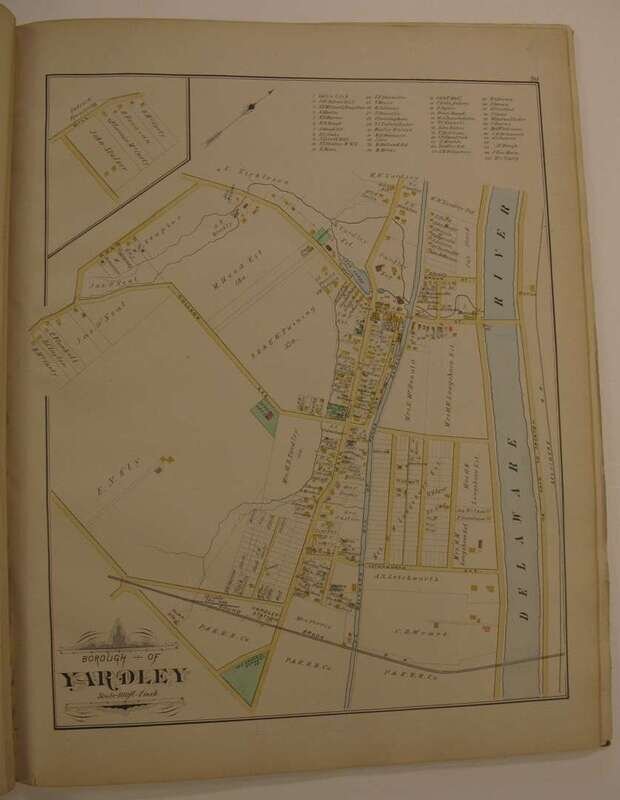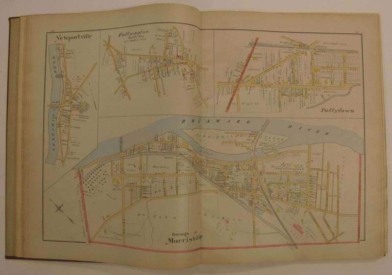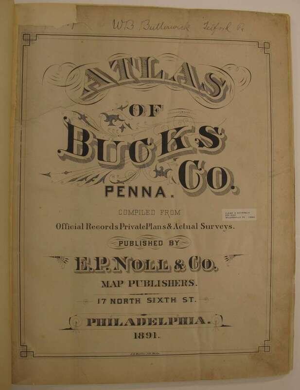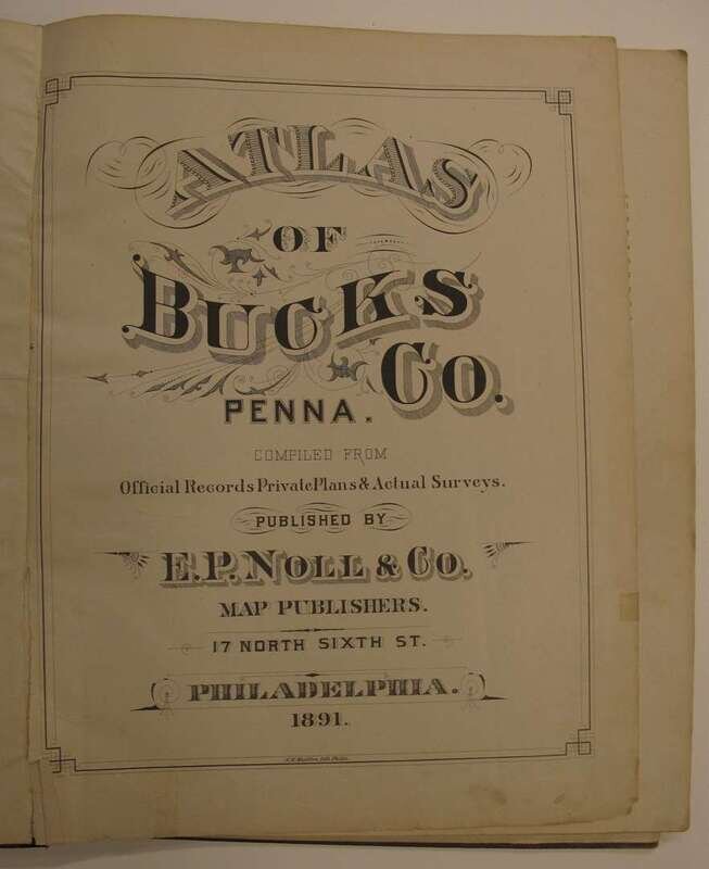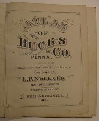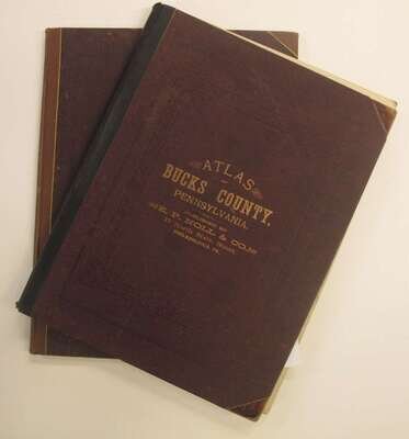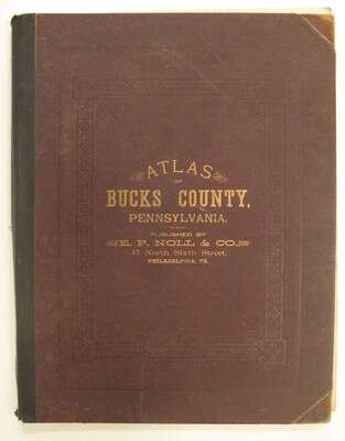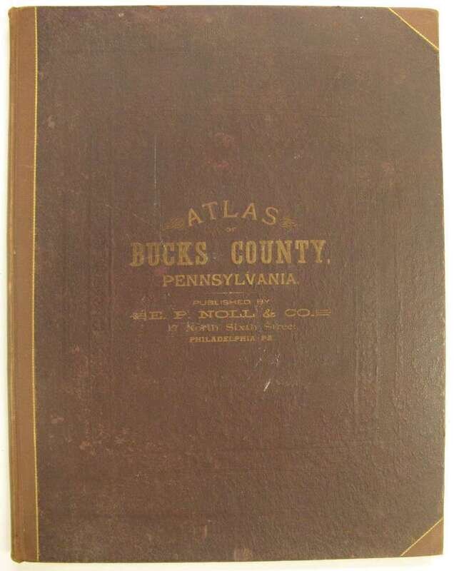 (County Atlases.) Noll, E.P., pub: Atlas of Bucks Co. Penn. Philadelphia, 1891. Folio, orig. gilt-lettered cloth, rebacked; scuffed. Color maps, incl. fold maps. Lacking Solesbury map. Some chipping, with paper loss to title, title and front matter slightly dusty, tears & repairs to U.S. PA & "Bucks County" maps. Internally generally clean. * Another copy of the preceding, orig. gilt-lettered cloth, crudely rebacked, casing coming loose. Color maps, incl. fold maps. Lacking the lower Makefield, Solesbury, Buckingham & Tinicum maps. Title-page creased. Sold with all faults.