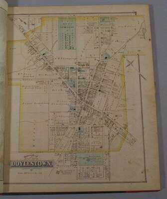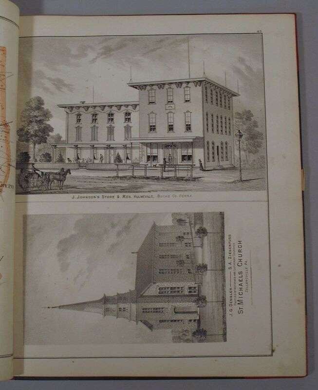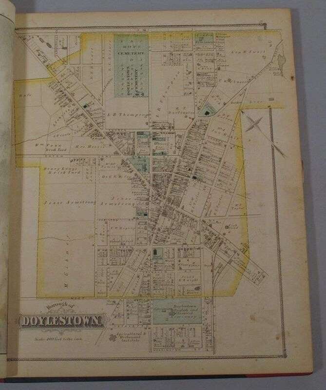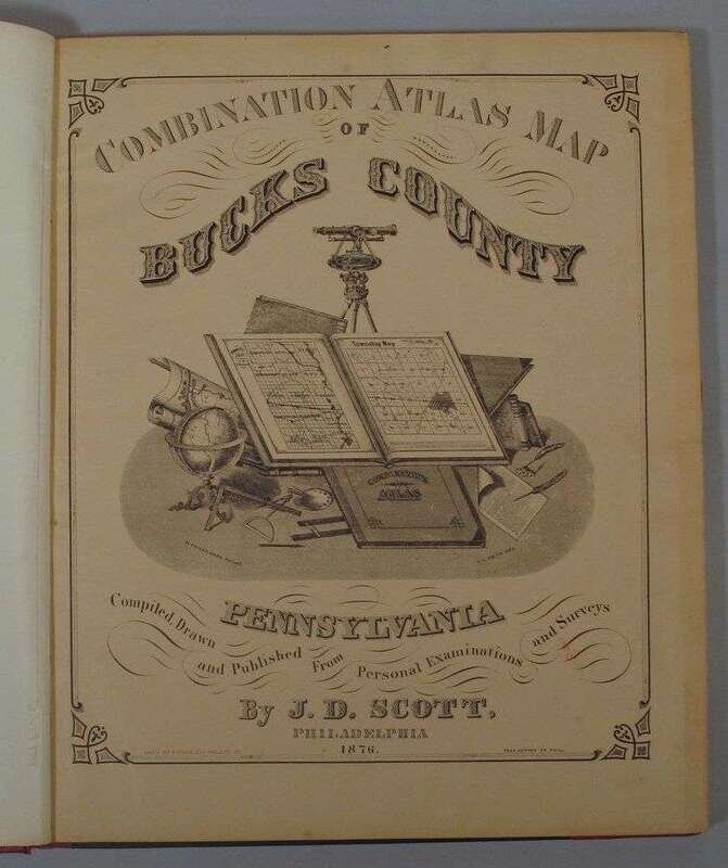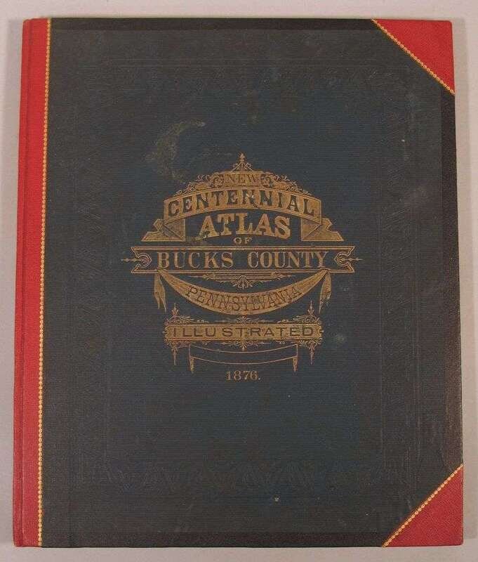 (Property Atlas.) Scott, J.D., pub. Combination Atlas Map of Bucks County, Pennsylvania. Philadelphia, 1876. Folio, orig. green cloth, gilt, modern red morocco back & corners. With 42 color maps, b/w litho. views. Occasional spotting, chipping to terminal text leaves. Le Gear L3013.