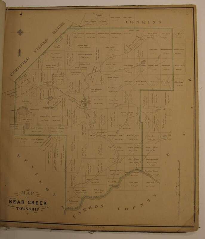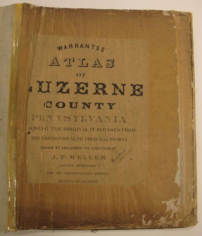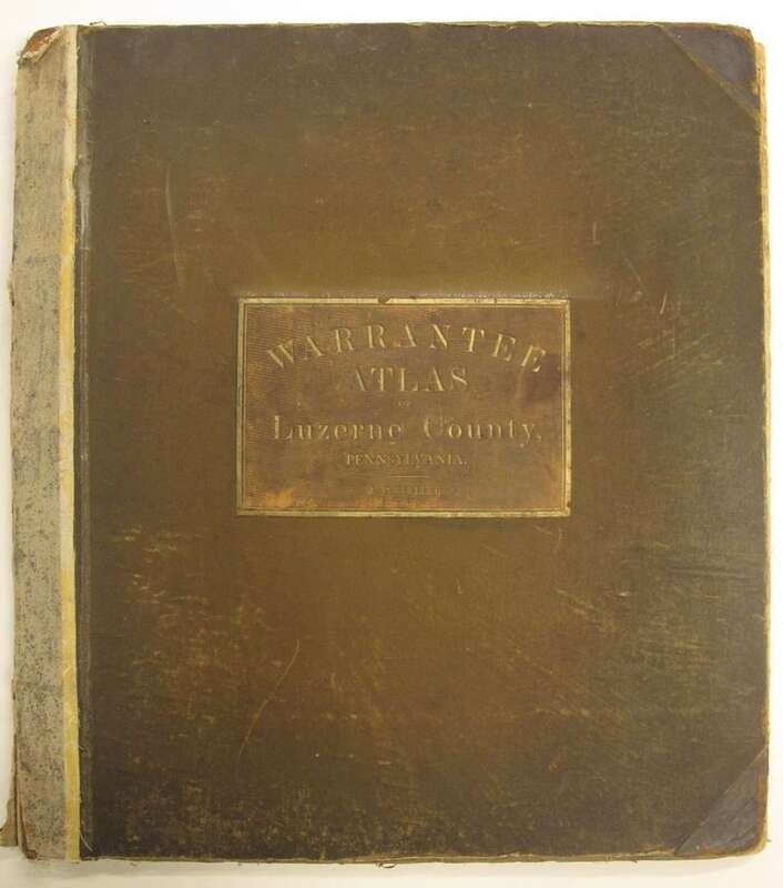(Property Atlas.) Weller, J.P. Warantee Atlas of Luzerne County, Pennsylvania....1775-1874. [New York]: [Charles M. Cornwell, 1874]. Folio, orig. cloth; worn. Title & front matter frayed & repaired. With 35 linen-backed color maps; often frayed.