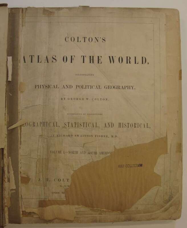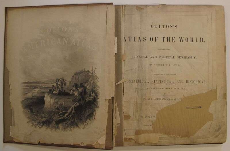 [Colton, J.H., pub.] Colton's Atlas of the World. [New York], [1855]. [Vol. I. North and South America.] Folio, modern buchram; worn & dusty. With 63 map sheets & c., incl. vignette title & insets. Vignette title printed. Title and other front matter torn and defective, occasional chipping & repairs to map sheet margins. Ex-library perforated stamp on map sheets. Sold with all faults. Includes Philadelphia, New York City, D.C., California and Texas maps.