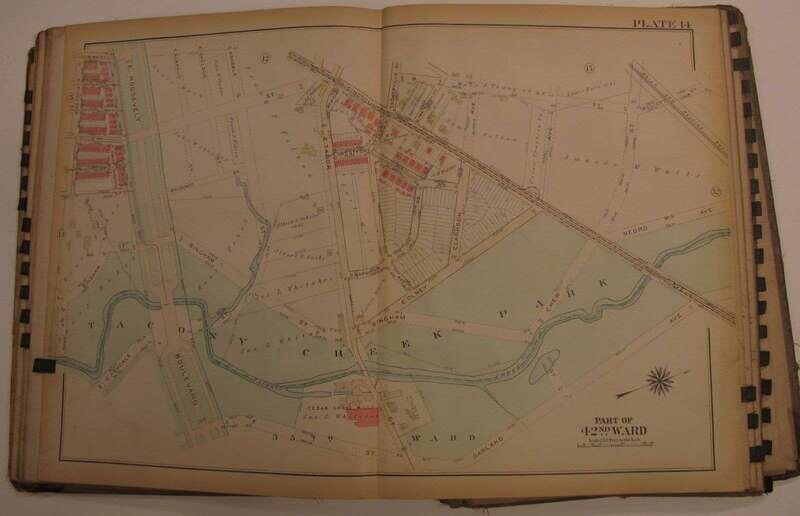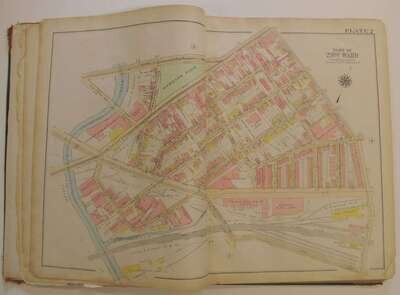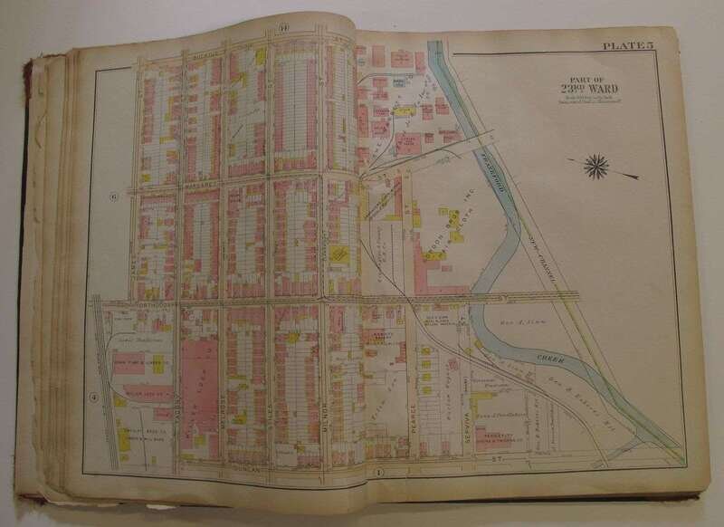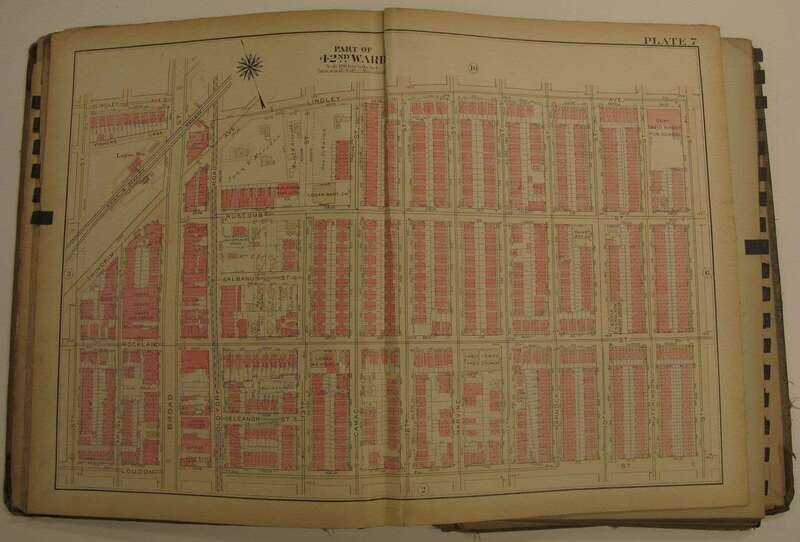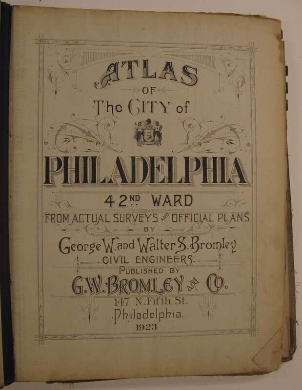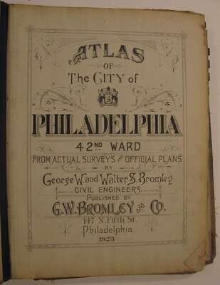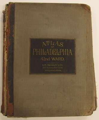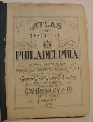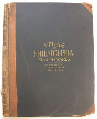 (Property Atlases.) Bromley, G.W., pub: Atlas of the City of Philadelphia 23rd & 41st cloth; worn. With index map + 30 double-page color maps. Title loose & chipped, front matter chipped, chip at lower right of index map - minor loss to body of map, close tears to maps 9 & 10, edges & maps a little dusty. Frankford river wards North of Frankford, Northeast Phila. east of Frankford Ave. * Atlas of the City of Philadelphia 42nd Ward. Philadelphia, 1923. Folio, orig. morocco & cloth, rubbed & worn, joints rubbed away. With index map + 36 double-page linen-backed color maps. Tabs present. Index map moderately dusty. Map edges often dusty, minor dampstaining at upper map gutter. Logan, Olney, Oak Lane, Wadsworth.