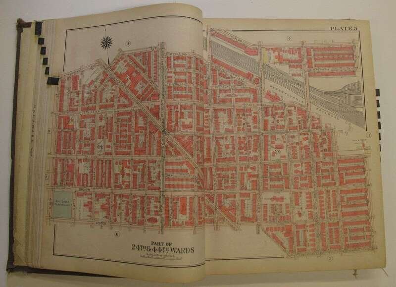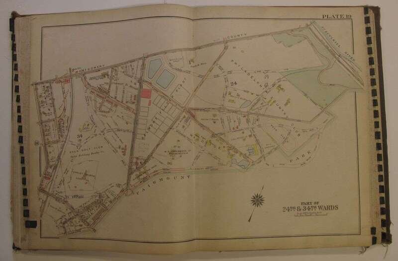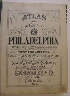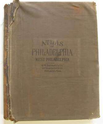(Property Atlas.) Bromley, G.W., pub. Atlas of the City of Philadelphia, Wards 24, 27, 34, 40, 44 & 46, West Philadelphia. Philadelphia, 1927. Folio, orig. cloth; worn & frayed, spine gone. With index map + 43 double-page canvas-backed color maps. Tabs present. Some creasing to bottom corners of title page & index map. Edges of maps slightly dusty. Includes University of Pennsylvania.