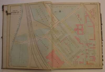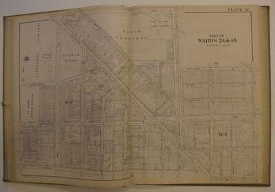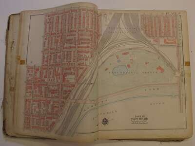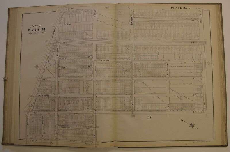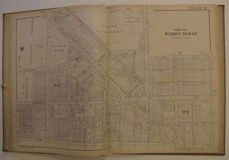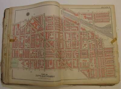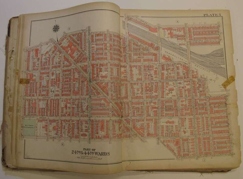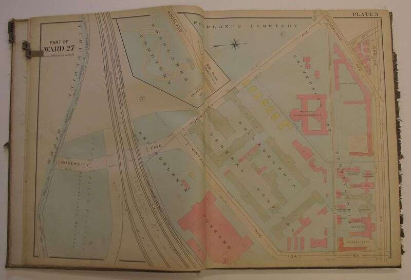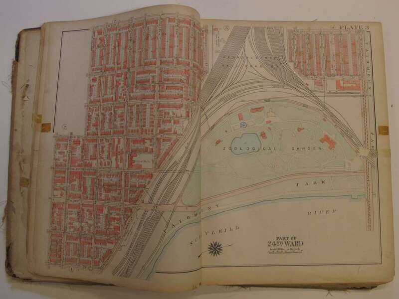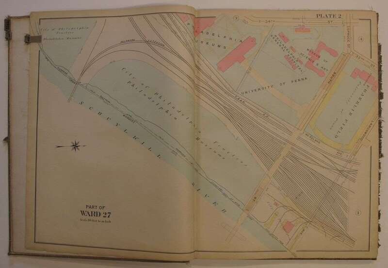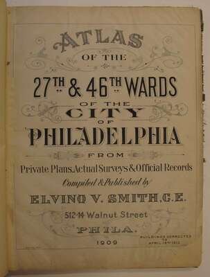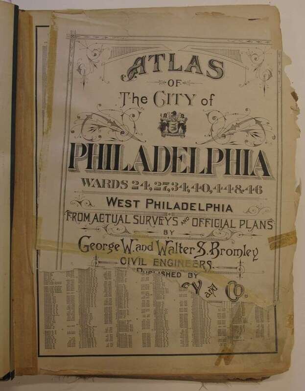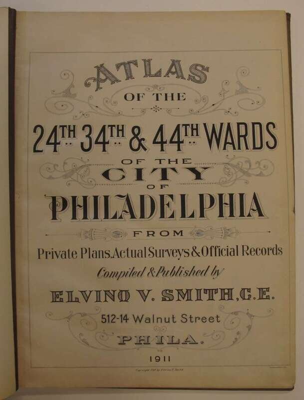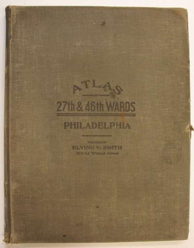 (Property Atlases - West Philadelphia & Environs): Smith, Elvino V. Atlas of the 27th & 46th Wards of the City of Philadelphia. Philadelphia, 1909. Folio, orig. cloth; worn & frayed. With index map + 21 double-page linen-backed color maps. Tabs present. Title-page & front matter dusty, chipped & repaired. Index map creased & moderately dusty, maps occasionally creased & slightly dusty. Corrected to 1913. * _ _, pub. Atlas of the 24th, 34th & 44th Wards of the City of Philadelphia. Philadelphia, 1911. Folio, orig. cloth; worn & occasionally stained. With index map + 37 (of 39) uncolored double page maps; old cellotape repair to index map. Lacking maps 1 & 2. * Bromley, G. W., pub. Atlas of the City of Philadelphia, Wards 24, 2, 34, 40 & 46, West Philadelphia. [Philadelphia], [1927]. Folio, orig. cloth; worn. With index map + 43 double page color maps. Title page defective, index map chipped. With losses, scattered old cello tape repairs, a few close tears (maps 6, 9, 11 & 20). Map 21 chipped. Sold with all faults.