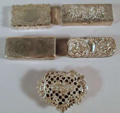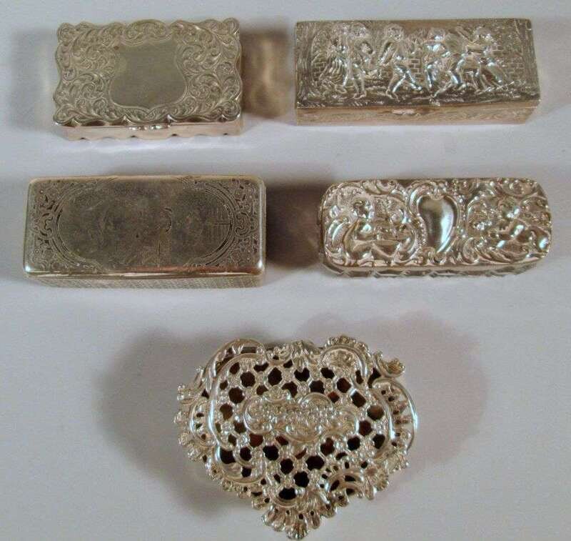 Including three elongated rectangular boxes, one Hanau with English export marks, one Swedish, the other cut glass with Walker & Hall repoussé silver lid, all with scenes of figures dancing in merriment and playing musical instruments, also two English silver floral and foliate scroll decorated boxes. (5).