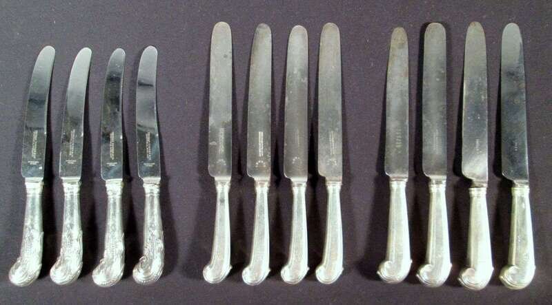 Including twelve knives with the crest of a tiger or leopard's head couped with fire issuing from the mouth and ears, hallmarks rubbed; eleven with embossed foliate grips engraved with the crest of a boar's head, maker's mark WA; and four with the crest of a wolf's head collared and erased, maker's mark SM. (27).