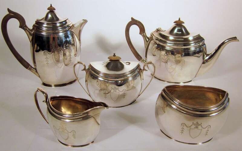 Comprising a tea and coffee pot with wood handles, sugar, creamer, and waste bowl, each of slightly flattened oval form with engraved reserve to either side in the form of a shield surmounted by a covered urn, one side encloses the crest of a bird with wings erect on a chapeau, reserve on opposite side vacant. Date letter rubbed. (5).