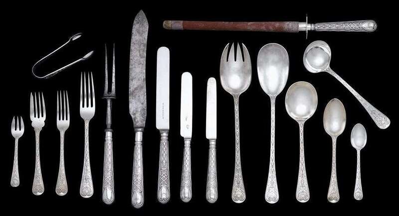 Comprising twenty-three luncheon forks, seventeen teaspoons, twelve each dinner forks, place spoons, soup spoons, and hollow-handle dinner and luncheon knives, eleven each salad forks, ice cream forks, and hollow-handle fruit and place knives with sterling blades, ten each tablespoons and demitasse spoons, three piece carving set, two ladles, salad set, and a pair of tongs, the terminals with shell motif, the stems with bell-flower pendant. Most with the monogram "VWK" surmounted by a crown on the reverse of each terminal; a few pieces with later date letters for 1928-29/29-30. (172).