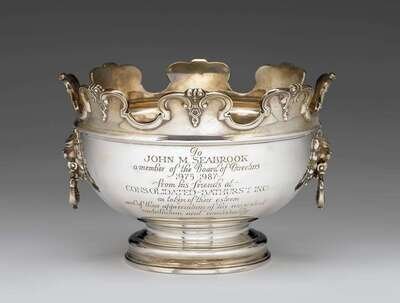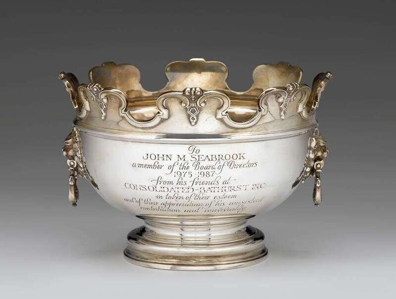 Circular stepped base, the body with cast twin lion's head drop-ring handles, gilt-washed interior, the notched scalloped rim with embossed scrolling foliate border. With later engraved presentation inscription dated to 1975-1987.