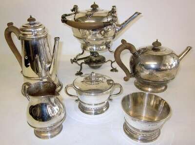 Comprising a tea and coffee pot, and hot water kettle on stand with burner with wood handles and finials, creamer, sugar, and waste bowl, each with reeded band to lower body above scalloped design on splayed circular foot. (6).