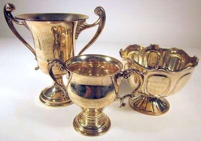 Including a C. J. Vander Ltd. twin-handled trophy cup, "Richmond Royal Horse Show"; "The Aldershot Show" trophy cup; and "The Cream Candy Challenge Cup," the latter two with maker's mark RGH. (3).