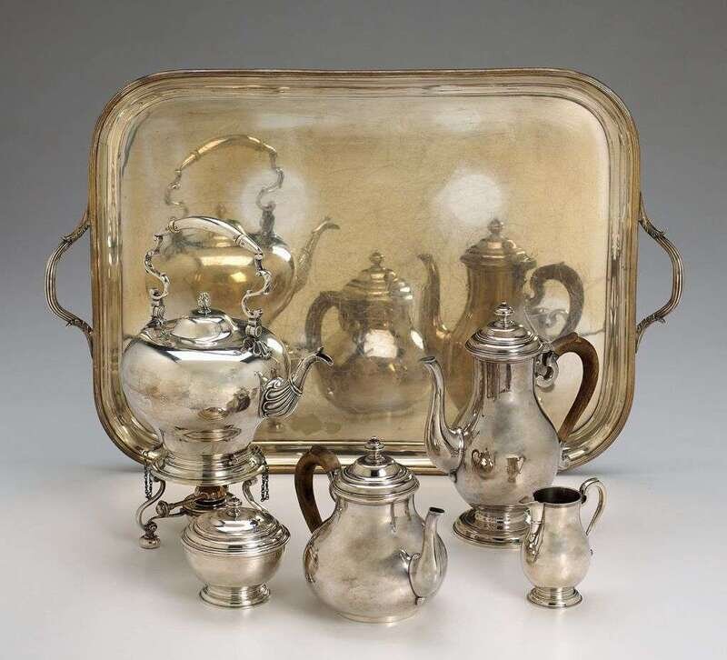 Modelled after a service by Humphrey Payne, 1722-23, the set a tea and coffee pot with wood handles, covered sugar, and creamer, slightly bulbous in form with reeded rims, varying date letters. Together with a George VI Edward Barnard & Sons Ltd. silver hot water kettle on stand with burner, with S-scroll handles, crested and partially fluted spout, raised on four bun feet, 1951-52, and a twin-handled silverplate tray. (6).