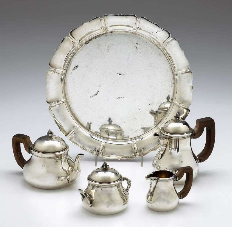 Comprising a tea and coffee pot, sugar, and creamer, squat form with square wood handles, the domed covers with artichoke finials, 950 standard. Together with a Watson Company sterling silver tray. (5).