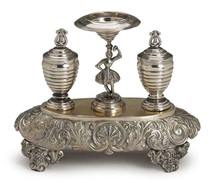 The oval stand with repoussé apron of foliated scrolls, mounted with a pair of reeded conical inkwells, the covers with lyre-form finials, flanking a candlestick in the form of a female dancer. Maker's marks rubbed.
