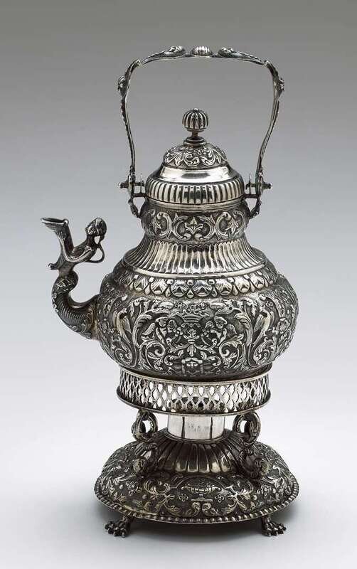 Dutch repoussé silver tea kettle on stand
