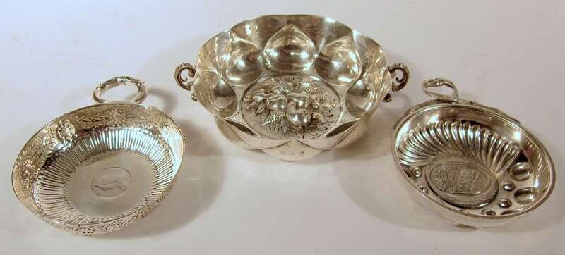 In the 17th century style, of lobed form with twin handles, the center repoussé-worked. Together with two further silver wine tasters, one French, the other silverplated, with coins inset to the bowls. (3).