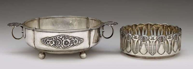Including a Jugendstil openwork silver mounted glass bowl retailed by Freytag and a twin-handled hammered silver bowl with glass liner, the handles and body with floral motifs. (2).