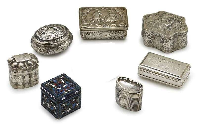 Three Dutch, two German repoussé with amorous scenes, an English snuffbox with marks for Thomas Shaw, Birmingham, 1823-24, the cover with presentation inscription, and a Russian Art Nouveau cloisonné enameled box. (7).