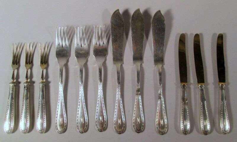 Comprising twelve each fish knives and forks, and twelve each weighted hollow-handle fruit forks and knives with gilt tines and blades, scalloped edges with engraved block letter M to handles. (48).