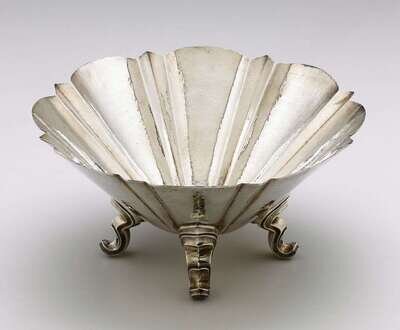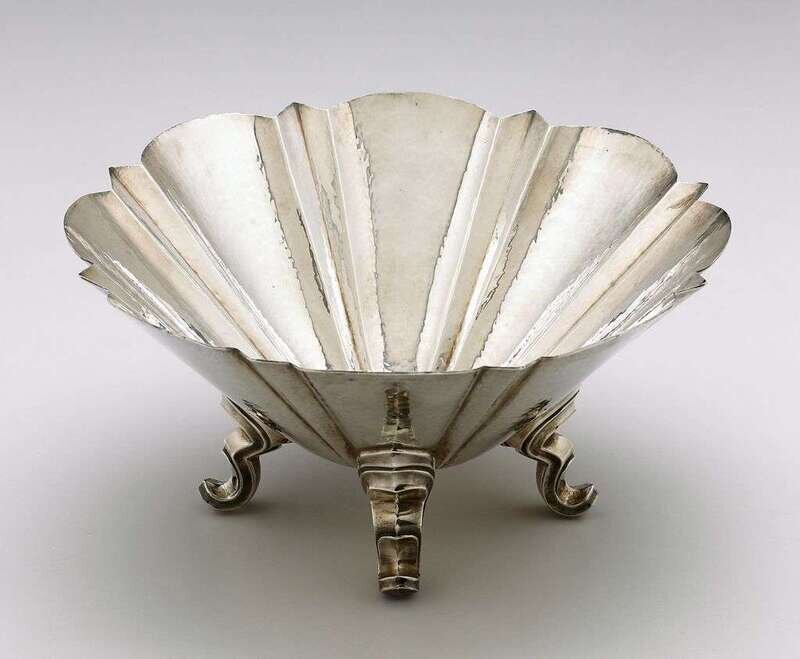 Large deep bowl, the rim with alternating scalloped and triangular points radiating from the center, raised on four scroll feet, 925 standard.