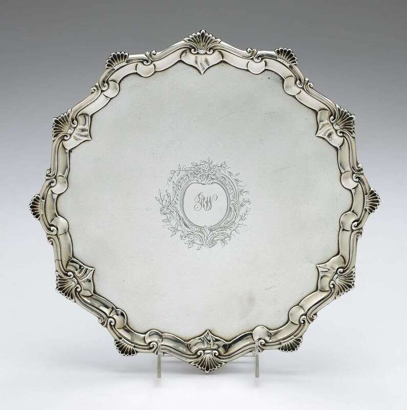 Circular form with shell and scroll rim, on three hoof feet. Monogram of Rodman Wanamaker to the center.
