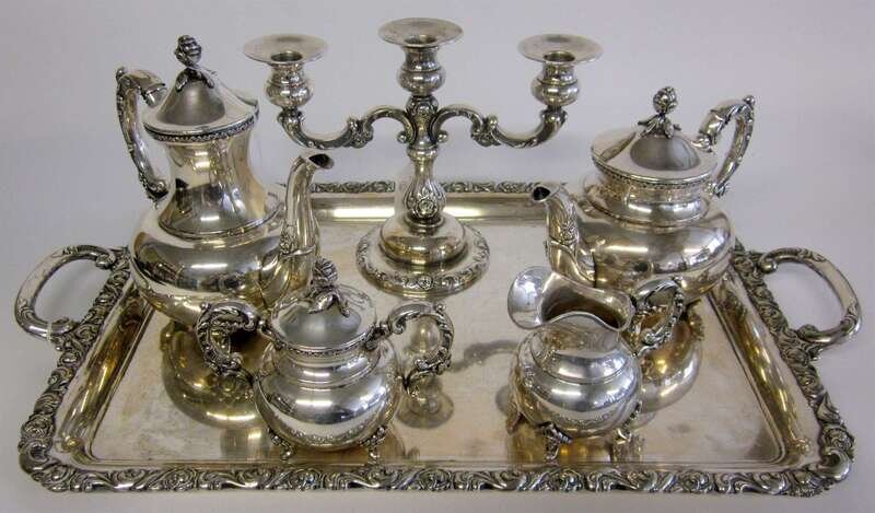 Comprising a tea and coffee pot, sugar and creamer, cast scrolling handles, floral capped feet and rosebud finials. Together with a silverplated tray and three-light candelabrum. (6).
