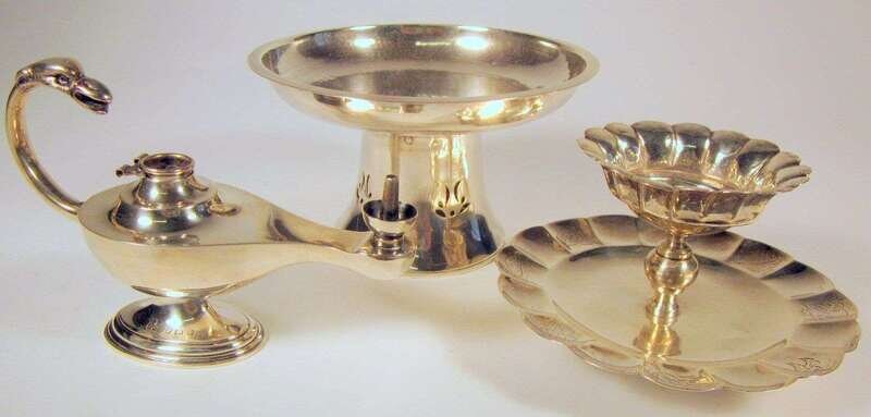 Including a George III Jabez Daniell & James Mince tazza, hammered body on pierced trumpet foot, London, 1769-70; Edward VII cigar lighter in the form of a Roman oil lamp on splayed oval base, the handle terminating in an eagle's head, Birmingham, 1902-3, maker's mark rubbed, probably Synyer & Beddoes. Together with a Maciel sterling double-tiered tray, Mexico City. (3).