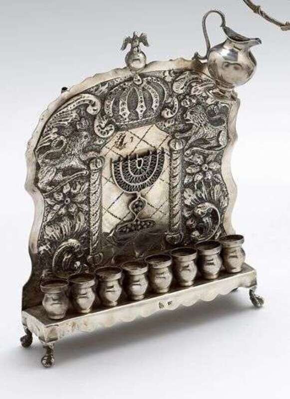 The backing displaying two lions flanking a central crown, an attached filigree menorah below with C-scrolls and florals to either side, raised on four ball and claw feet, the shamash in the form of a ewer. Spurious hallmarks to base.