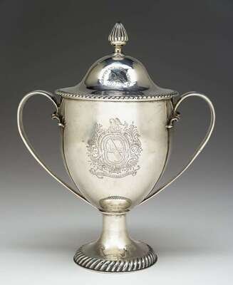 Vasiform on trumpet foot, fluted handles, the domed cover with bud finial, gilt-washed interior. The body bearing the Murray-Stewart family crest of a pelican in her piety, a coat-of-arms, and the motto "Virescit vulnere virtus."