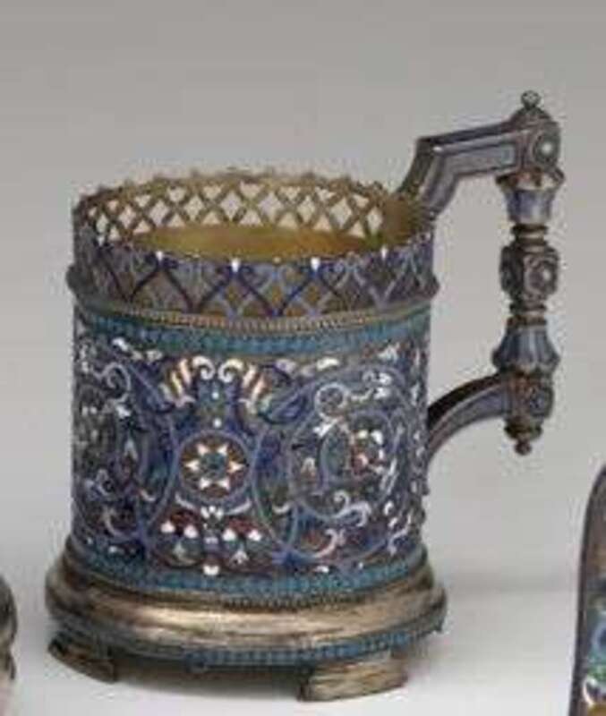 Russian cloisonné enamel silver podstakannik or tea glass holder gustav klingert, assay master anatoly artsybashev, moscow, 1892