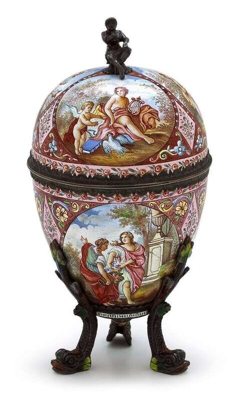 The oviform cup with painted panels depicting classical figures in arcadian landscapes, set on a tripod base terminating in dolphin feet, the cover with figural finial in the form of a seated female.