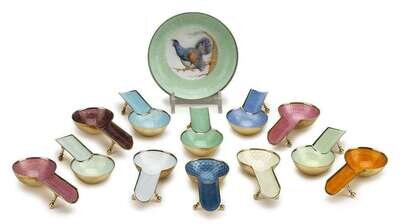 Set of twelve Continental silver-gilt and guilloché enamel individual ashtrays