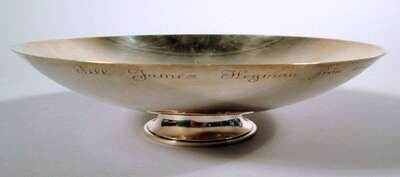 Shallow bowl raised on low foot. Engraved Swedish inscription to underside, dated 13.11-1947.