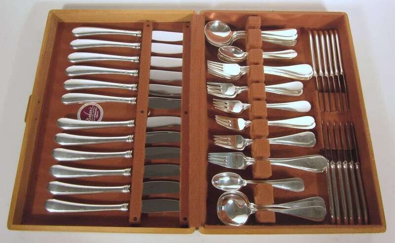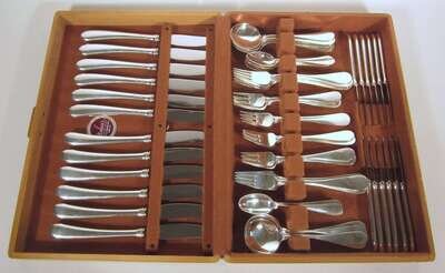 Comprising twelve each spoons, salad forks, soup spoons, and hollow-handle dinner and butter knives and eleven dinner forks, heart-shaped motif to reverse of spoons and forks, in fitted wooden box.