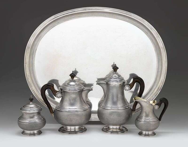 Comprising a tea and coffee pot, covered sugar, creamer, and tray; pyriform with segrinato-engraved surfaces, rosewood handles and finials, the sugar and creamer with gilt-washed interiors, the tray with conforming textured border. (5).