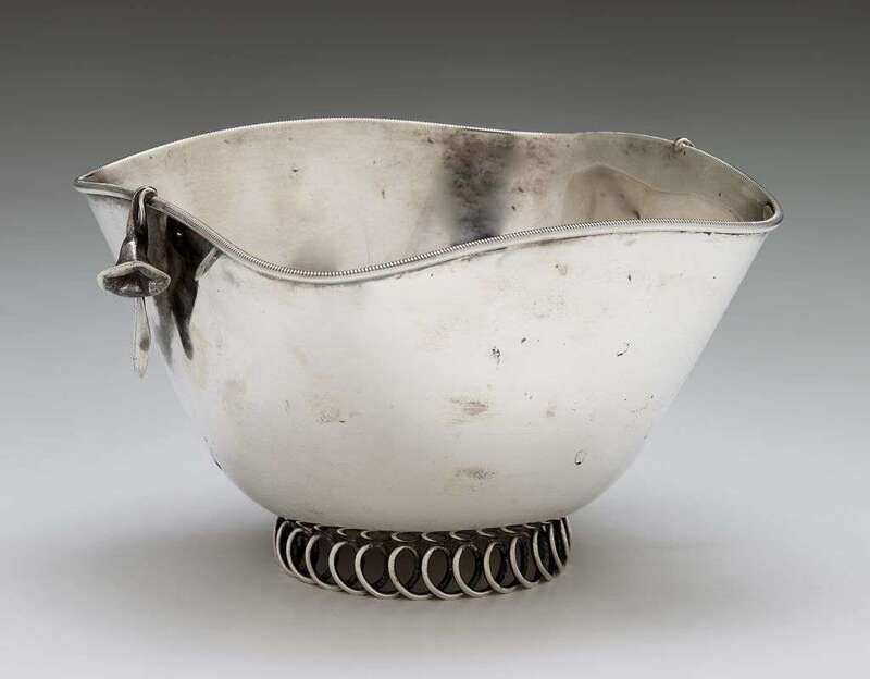Of square form tapering to an openwork base, the reeded rim with applied handles in the form of morning glories.