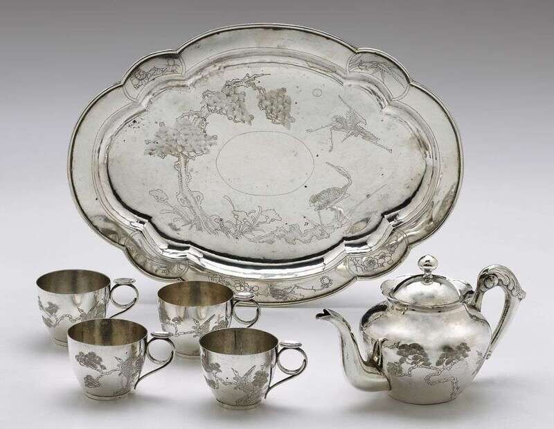 Comprising a teapot, four cups, and shaped oval tray on four ball feet, each article engraved with a design of storks amongst pine trees. (6).