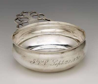 Circular form with applied openwork scroll handle engraved "S" over "ME," the bowl also inscribed and dated September 28, 1820.