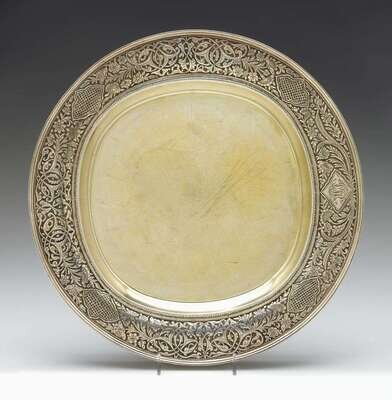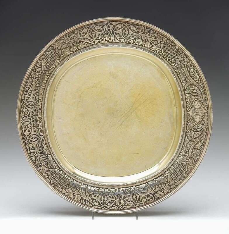 Circular form, the border with interlaced arabesques and florals upon a stippled ground, interspersed quarterly with four cartouches, gilt-washed basin. The reserve engraved with interlaced monogram.