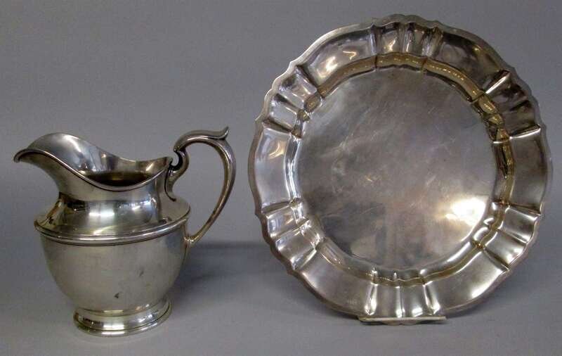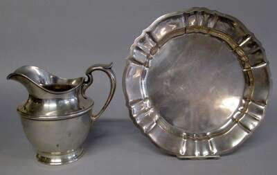 "Chippendale" tray with piecrust rim, the pitcher on circular foot with wide spout and applied handle. (2).