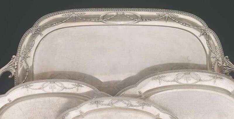 Rectangular form, repoussé-worked border decorated in the neoclassical style with guilloche rim.