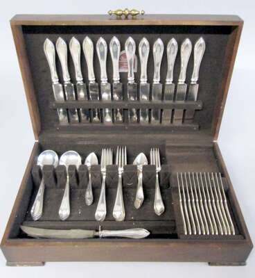 "Priscilla" pattern, comprising seventeen teaspoons, twelve each butter spreaders, soup spoons, and hollow-handle knives, eleven forks, five salad forks, and a hollow-handle carving knife and fork, in fitted wood case. Monogrammed. (71).