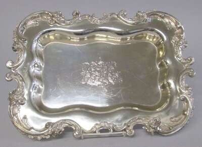 Rectangular form with shaped scroll and floral border, interlaced foliate monogram to interior.