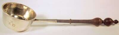 Cylindrical bowl, turned wood handle extending from socket with heart-shaped appliqué. Engraved initials to bowl.