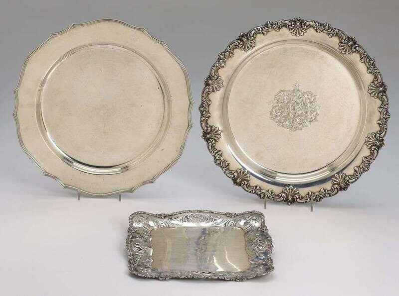Including a Bailey, Banks & Biddle square tray with pierced and repousse border; the second of circular form with applied foliated scroll rim by Redlich & Company and retailed by J .E. Caldwell & Co.; and a Gorham circular tray with shaped rim retailed by Bailey, Banks & Biddle. (3).