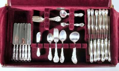 Including Wm. B. Durgin Co. "Marechal Niel" pattern, twelve each forks and teaspoons, nine each cream soup spoons and place spoons; Reed & Barton "Les Cinq Fleurs," twelve each cocktail forks and bouillon spoons; twelve Durgin "Madame Royale" salad forks; seven Wallace "Rose" butter spreaders; and twelve hollow-handle dinner knives and six blunt blade knives of similar designs. (103).