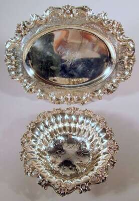 Including a Frank W. Smith Silver Co. chased tray with applied C-scroll and leaf border, foliated initial engraved to center and a Gorham fluted bowl with "strapwork" design to base, the rim with scroll and floral bud motif. Monogrammed. (2).