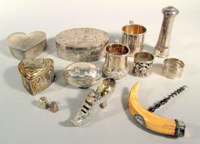 Including a corkscrew with silver-mounted tusk-form handle; a Graff, Washbourne & Dunn heart-shaped box; Gorham repoussé oval box; two child's mugs and two napkin rings. Together with two German repoussé silver boxes, one displaying a classical concert with attendees in 18th century garb, the other of a religious scene; a Hanau Rococo style shoe with London import marks; two Thai or Indian thimbles; and a silverplated grinding handle. (13).